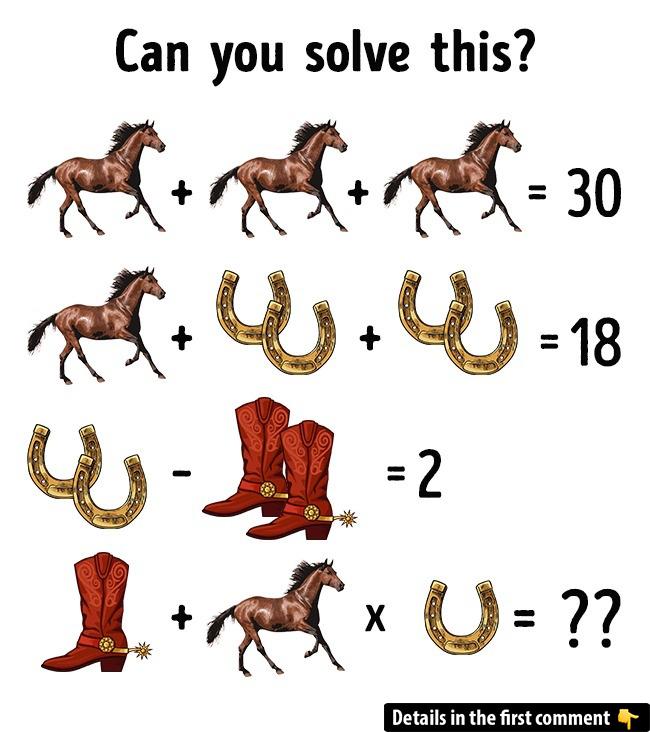Welcome to another fun brain teaser! This puzzle challenges you to figure out the missing number using symbols that represent horses, horseshoes, and boots. It looks simple at first, but the trick lies in deciphering the correct relationships between the symbols. Ready to dive in? Let’s see if you can solve it!